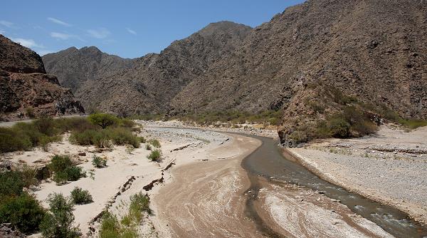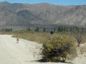 Ab Pie de Medano enden dann endlich die Dörfer, ab hier gibt es erst einmal keine Felder, denn der Fluss kommt erst hier aus den Bergen. Man durchquert eine weite, staubige und sandige Ebene namens Campo Arenal - sandiges Feld - der Name ist Programm. An unserem Reisetag war es extrem windig und kleine Mini-Tornados aus Staub und Sand zogen quer über die Fläche und fielen wieder in sich zusammen. Die Luft war grau und in der Sandsteppe bewegten sich nur ein paar Mulis. Die Einwohner nennen diesen Flecken auch gerne "argentinische Sahara". Auch an einem anderen Tag fegte hier der Wind von den Bergen ins Tal, ganz windstill wird es wohl selten und die Luft flimmert.