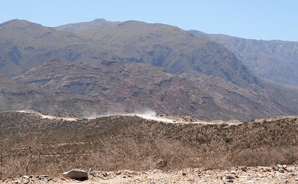 Auf dem Weg von Amaicha del Valle nach Fiambala bewegt man sich meistens auf der Ruta 40, die sehr unterschiedliche Straßenqualität aufweist. Von Staubpiste bis Asphalt ist alles vorhanden. Die Szenerie ist oft relativ langweilig und führt durch ein breites Tal, wobei die angrenzenden Berge im Oktober meist im Dunst lagen. Es war noch recht windig und es hatte lange nicht mehr geregnet, so wurde der feine Staub bis hoch in die Berge gewirbelt.