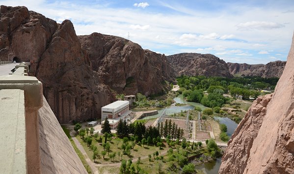 Oben auf der Staumauer angekommen hat sich wenig verändert. Auf beiden Seiten gibt es immer noch die kurzen Tunnels. Der Stausee ist ca. 7.000 ha groß, der 255 Meter lange Damm wurde schon 1943 von dem Ingenieur Antonio Pronsato geplant. Die Bauarbeiten begannen am 19. April 1963, als José María Guido Präsident von Argentinien war.