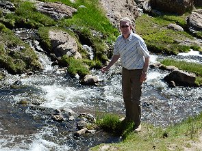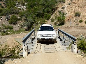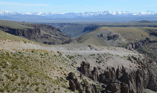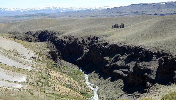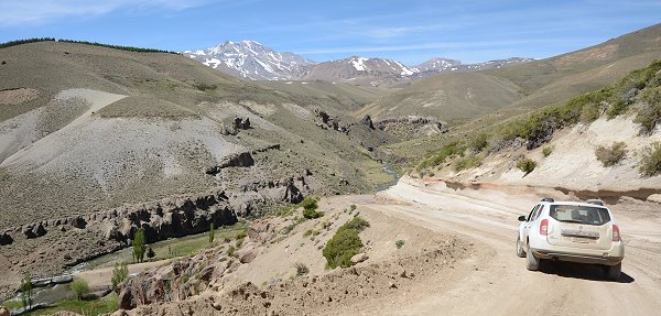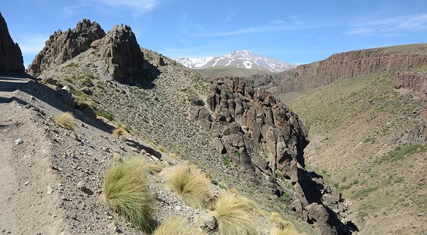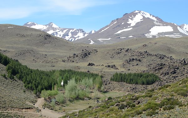 Stets im Blick war nun der höchste Vulkan von Patagonien ins Bild: der mächtige und mit Schnee bedeckte 4.709 Meter hohe Domuyo. Vor lauter Begeisterung hatten wir fast vergessen etwas zu essen, aber als wir auf einer Holzbrücke einen eiskalten Bach überquerten machten wir im Tal eine Rast. Orangensaft, Käse und Joghurt, die sich durch die Sonneneinstrahlung im Auto aufgeheizt hatten, kurz ins einskalte Wasser legen und dann genießen. Wir sahen Raubvögel am Himmel und genossen die Stille. Nur das Gurgeln des Bachs war zu hören. Dummerweise war der Bach gar nicht so kalt wie in dieser Höhe bei Schneeschmelze zu erwarten wäre, ein Zeichen dafür, dass überall in den Bergen zum Teil heiße oder warme Quellen die Bäche speisen.