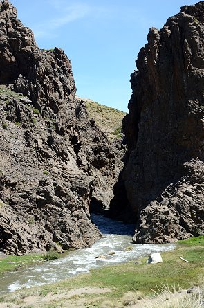 Weiter geht die Fahrt über die gut ausgebaute Straße, vorbei an einigen Wald-Anpflanzungen, die hier und da regelmäßige grüne Flächen in der graubraunen Hochgebirgslandschaft bilden. Irgendwann geht es steil in ein Flußtal hinunter, vor der Brücke liegt ein einsames Gehöft, das als Basiststion für die Strassenbauarbeiter dient. Dahinter folgt eine heftige Steigung mit Serpentinen auf der anderen Seite, es geht stetig wieder bergauf. Dabei passierten wir ein paar hübsche Felsformationen. Auf dem Video unten habe ich sie bei der Rückfahrt gefilmt.