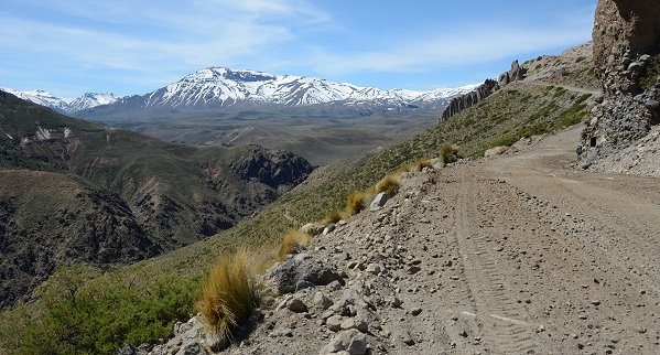 Oben hielten wir wieder an und machten Fotos vom Vulkan, es gab wie überall in Argentinien auch diverse Altäre in den Felsen am Wegrand. Kurz dahinter wussten wir dann, warum die Straße so gut zu befahren war. In dieser Höhe war der Grader gerade mit dem Planieren der Strecke beschäftigt, die Männer grüßten freundlich, rangierten etwas zur Seite und wunderten sich sicher über den zu dieser Jahreszeit ungewohnten Besuch. Bei Regen oder schlechten Wetterprognosen hätten wir die Fahrt bis hierher sicher nicht geschafft. Ein Allradantrieb ist hier schon von Vorteil, wenn das Wetter im Vorfeld schlecht ist oder zu wechselhaft wird. Einige Teilstücke der Strecke sind schon sehr steil und bestehen nur aus Geröll oder Erde.