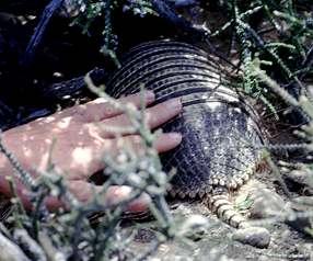 Der Schwanz und auch die Füße sind mit harten Verknöcherungen überzogen. Ein Gürteltier hat lange Krallen, die es dem Tier ermöglichet, sich ebenso wie ein australisches Echidna blitzschnell in den Boden zu graben. Kein Angreifer holt es dann da wieder wieder heraus.