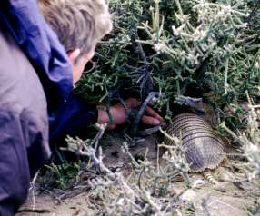 Dann suchten wir erst einmal eine ganze Weile, obwohl es dort, wo das Tier verschwunden war, nur einige kleine niedrige Büsche und übersichtlichen Boden gab. Michael entdeckte das Gürteltier dann schließlich doch unter einem Busch sitzend, nur etwa zwei Meter von der ersten Sichtungsstelle entfernt. Dort war der Boden steinig und es konnte sich nicht eingraben, eine Astgabel behinderten sein Vorwärtskommen. Also stellte es sich tot, und sein steinfarbener Panzer stellte eine gute Tarnung dar. Erst streichelte Michael sachte den gepanzerten Rücken. Zwischen den Panzerringen stehen regelmäßig etwa 5 cm langen Borsten heraus, dick wie ein Pferdehaar und von der Funktion her eine Art Sensor. Bei Berührung der Borsten zogen sich die Ringe des Panzers noch etwas stärker zusammen.