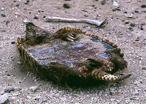 Die erste Sichtung war eher traurig und fand auf der Halbinsel Valdés statt: dort lag ein überfahrenes Tier am Straßenrand, ein Zeichen für die Rücksichtslosigkeit der Autofahrer. Auf dem kleinen Bild ist es zu sehen. Eigentlich hatten wir überall gelesen, dass dieses Tier an einem Parkplatz auf der Halbinsel besonders zutraulich sind. An keinem Parkplatz sahen wir auch nur ein Härchen vom "Larger hairy Armadillo", fanden nur bei einem Abendspaziergang ein weiteres totes Tier in der Nähe unserer Unterkunft. Danach passierte lange nichts mehr.