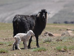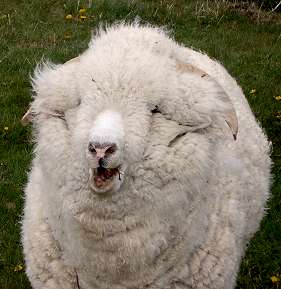 Die Wolle in der Augengegend wird dann extra geschoren, damit sich dort während des Winters kein Eis bildet und die Tiere noch freie Sicht beim Grasen haben. Um dem eisigen Wind zu trotzen, stehen sie oft sehr dicht zusammen. So kommt es bisweilen vor, daß sie sich genseitig ersticken. 10-15% einer Herde kommt im Winter um, in besonders harten Wintern können es auch bis zu 40% sein. So werden über Generationen die besten Wollproduzenten herausselektiert.