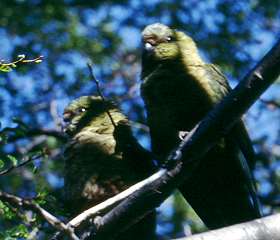 Im Wald neben der Straße sieht man mit Glück Schwärme von olivgrün-roten Sittichen namens Cachaña (Enicognathus ferrugineus, auf deutsch heißen sie Smaragdsittiche). Sie fallen erst durch ihr heiseres Krächzen auf, bevor man die gut getarnten, ca. 35 cm großen Tiere im üppigen Grün überhaupt sieht. Meist picken sie auf dem Grasboden herum oder sitzen schmusend in den Ästen. Während der Nahrungssuche sind sie wenig scheu und sie fliegen nur geradlinig meist dicht über dem Boden ein paar Meter davon wenn man sich nähert. Während des Fluges und bei Gefahr verständigen sie sich mit lauten, metallisch klingenden Schreien.