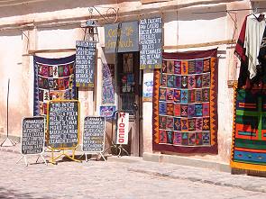 Davor gibt es einen Markt rund um die Plaza, auf dem man gewebte Stoffe, Schals, Ponchos, Silberwaren, Flaschen mit färbiger Erde der Region und Heilkräuter kaufen kann. In den wenigen Häusern haben sich meist Souvenir-Shops unterschiedlicher Größe und Läden mit Silberschmuck und Kunsthandwerk niedergelassen. Alles hier ist voll auf Tourismus ausgelegt.