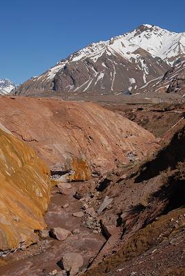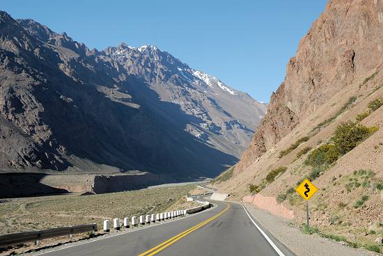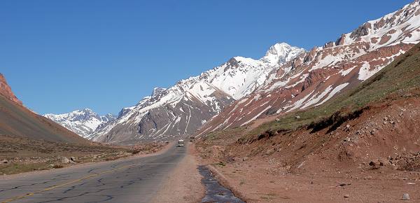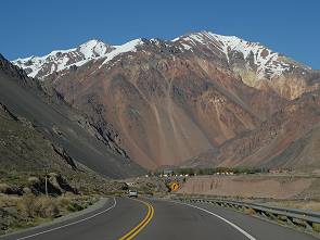 Zuerst ist die Fahrt durch das weite Flusstal eher unspektakulär, mit zunehmenden Kilometern wird die umgebene Berglandschaft aber immer eindrucksvoller und die steilen Hänge rücken näher an die Ruta 7 heran. Lange Schuttschleppen wirken fast wie eine Mondlandschaft. Die Eisenbahn begleitet die Strasse und man fährt an kleinen Bahnhöfen und ehemaligen Mineorten vorbei, die jedes Jahr wieder Opfer der Wassermassen bei der Schneeschmelze werden.