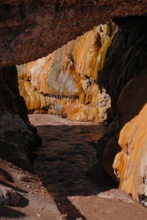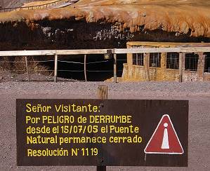 Der Bogen ist 47 Meter hoch, 28 Meter breit und spannt sich frei über den Fluss. Wahrscheinlich war er einmal ein Teil des Handelsweges nach Chile. Kein Mensch hätte dem eher unscheinbaren Bogen mehr Aufmerksamkeit geschenkt, wäre da nicht direkt nebenan eine stark schwefelhaltige, heiße Quelle gewesen. Ihr Wasser färbte die Felsen rund um den Bogen in dekorativem Orange, Rot und Gelb ein, die chemischen Reaktionen an den Felsen sorgen für ein fast surrealistisches Bild. Grünliche Algen sind ein weiterer Farbklecks.