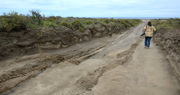 Nachdem wir schon knapp 50 Kilometer gefahren waren, änderte sich dann plötzlich der Untergrund der Ruta Provincial. Jetzt wurde die Strecke schlammig und glitschig, mit zahlreichen Pfützen. Am frühen Morgen war wohl direkt nach dem Regen ein großes Allradfahrzeug mit dicken Reifen vom Punta Ninfas zurück nach Puerto Madryn gefahren und hatte überall tief aufgewühlte Spuren hinterlassen. In die Gegenrichtung waren wir sichtbar die ersten Besucher des Tages.