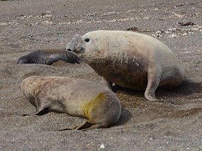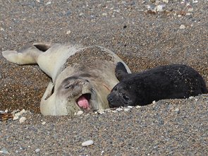 Unser Männchen hatte noch keine sehr ausgeprägte Nase und war auch noch nicht so groß. Mit drei bis vier Jahren werden See-Elefanten geschlechtsreif. Bullen sind allerdings erst im Alter von acht oder neun Jahren stark genug um einen Harem zu bewachen, hier waren es nur drei Weiber mit jeweils einem Jungtier. Eine Paarung zu einem früheren Zeitpunkt ist eher unwahrscheinlich und unser Bulle war auch noch etwas unerfahren. Wir konnten den ganzen Vorgang, der ziemlich lange dauerte, jedenfalls in aller Ruhen beobachten, filmen und fotografieren.