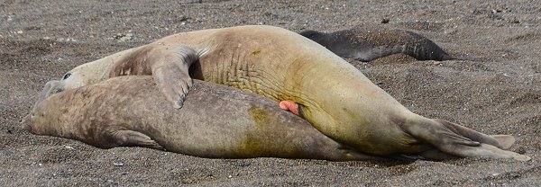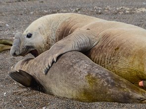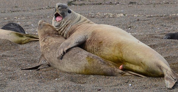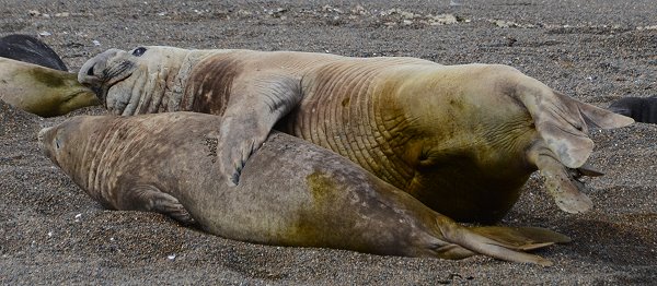 Bei unserem Besuch am Strand von Punta Norte konnten wir noch etwas Faszinierendes beobachten. Während die die größten Robben der Welt, die See-Elefanten, meist faul am Strand liegen und sich ab und zu mal mit Kies bewerfen, gab es hier richtig Action. Ein junges Männchen hatte sich ein Weib seines kleinen Harems zur Fortpflanzung auserkoren, doch die Angebetet war etwas unwillig.