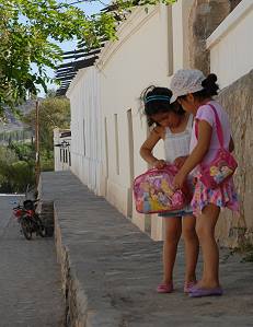 Gegenüber dem Kircheneingang befindet sich das Museo Arqueológico "Pío Pablo Díaz" mit schattiger Säulenhalle in Richtung Plaza. Im Inneren kann man 5.000 Fundstücke besichtigen, die eine Zeitspanne von 10.000 Jahren umfassen. Die Sammlung wurde in den 1970er Jahren von einer Gruppe Archäologen angelegt. Geht man vor der Säulenhalle entlang geradeaus in die Straße namens Bustamente, findet man ein kleines Geschäft namens Inti Kausay, in dem ein einheimischer Künstler Kakteenholz verarbeitet. Direkt daneben liegt unser Lieblingsrestaurant Ashpamanta, in dem wir zwei mal essen waren. Dahinter einmal links um die Ecke und gleich wieder rechts, dort findet man an der nächsten Kreuzung einen kleinen Laden namens Mandala (dort, wo das Fahrrad vor der Türe liegt). Hier gibt es Silberschmuck und kleine Kunstwerke zu kaufen, die vom Künstler selbst in der kleinen Werkstatt im Nebenzimmer geschaffen werden. Hier habe ich einen wunderschönen doppelten Silberring erstanden, dessen Aussenring mit indianischen Symbolen verziert ist und sich um das Innenteil drehen lässt.