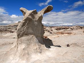 Der nächste Stopp hat einige Überraschungen parat, hier sollte man bei Sonnenschein Wasser und eine Kopfbedeckung mitnehmen. Zuerst kommt man nach wenigen Metern zu einer Skulptur, die in etwa einer Sphinx entspricht. Je nach Blickwinkel kann man sie ganz gut als solche erkennen. Dann führt der Weg allerdings noch ein Stück weiter, durch eine fast unwirklich anmutende Mondlandschaft. Ab und zu lockern ein paar Büsche, trockene Zweige oder seltsame Strukturen die Landschaft auf. Ein paar große, runde Felsen wurden von einigen aus der Gruppe fachgerecht als versteinerte Dinokacke identifiziert. Am Ende des Weges liegt eine weitere, oft fotografierte Sehenswürdigkeit: Cancha de Bolas.