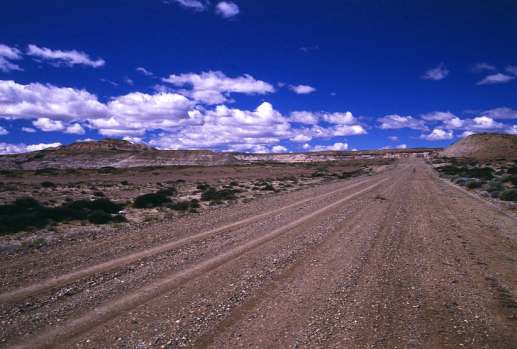 Als wir am ersten Abend zu den versteinerten Wäldern fuhren war der Himmel bedeckt und beim Rundgang regnete es ein wenig. Daher beschlossen wir noch einmal her zu kommen und mit viel Glück hatten wir am nächsten Morgen dann auch Traumwetter. Das Bild unten zeigt die Straße.