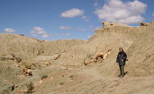 Wenn man um die Ecken biegt, springt der Wind einen geradezu an. Aber man hat eine herrliche Aussicht auf die noch tiefer gelegene Ebene, das Valle Lunar. Ab und zu liegen schon vereinzelte versteinerte Baumstämme am Wegrand.