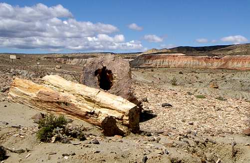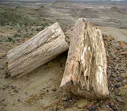 Ein kurzer, steiler Pfad führt in einer Erosionsschlucht neben freigelgeten Baumstämmen hinauf auf eine Ebene. Vom Rand hat man wieder einen schönen Blick zurück auf die Pyramide und den zurückgelegten Teil des Weges. Man erkennt jetzt deutlich die Schichtung der Ablagerungen und aus welcher dieser Schichten hier überall die Baumstämme herausgewaschen werden. Oben auf der Ebene liegen dann noch viel mehr dicke, versteinerte Baumstämme. Hier fallen aber vor allem die zahlreichen Späne auf. Es sieht aus wie der in einem Sägewerk verstreute Abfall. Läuft man hindurch, so wird der Schritt aber nicht vom "Sägemehl" gedämpft, sondern die Stein-Splitter erzeugen klingende und klimpernde Geräusche.