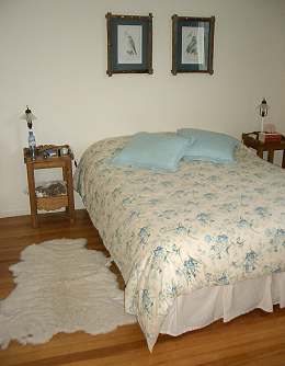 Das Zimmer ist gemütlich ausgestattet mit allem Komfort, den man hier am Ende der Welt erwarten kann. Vom Fenster hat man einen Blick auf den Garten, im November blühten hier große Mittagsblumen in bunter Pracht. Es gibt Schafffelle auf dem Holzfußboden, ein nettes kleines Bad und ein Bett mit zwei Nachttischen und Leselampen.
