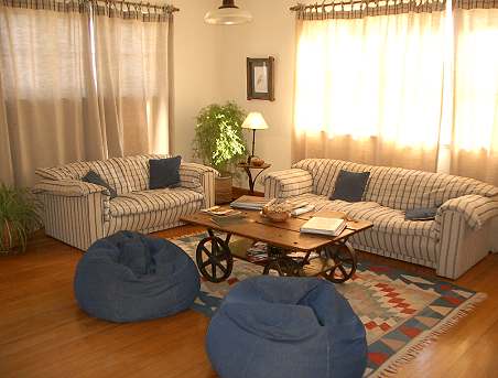 Tritt man durch die Eingangstür, so steht man zuerst im Vorraum mit einer gemütlichen Sitzecke mit Sofas und einer kleinen Küche. Hier gibt es kostenlos Kuchen, Tee, Kaffee und Wasser. Eine nette Dame kümmert sich um Ordnung und Wünsche der Gäste, sie ist so etwas wie der gute Geist und wohnt auch in einem Zimmer mit im Haus.