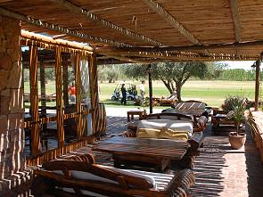 Nach dem Frühstück kann man sich auf der Terassee rund um das Restaurant noch ein wenig in den massigen Sitzmöbeln aus Holz entspannen, immer mit Blick auf den Golfplatz und auf alte Olivenbäume.