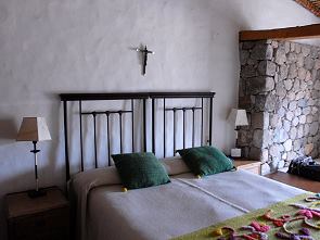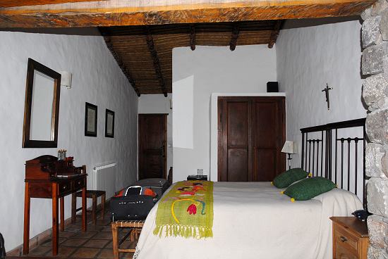 Unser Zimmer Nummer 3 war geräumig und nett eingerichtet für eine Familie, eine Stufe führte hinunter zu zwei weiteren Einzelbetten, auf denen wir unsere Koffer und Sachen liegen lassen konnten. Die Einrichtung ist rustikal mit dunklem Holz, schönem Fliesenboden, Steinsäulen und Holzdecke. Die Wände sind weiß und über dem Bett hängt stilecht ein Kruzifix. Handgestickte Wolldecken sorgen für den Farbtupfer im Raum. Hier gibt es sogar Zentralheizung, sehr angenehm in kalten Nächten. WiFi-Empfang gibt es auch in den Zimmern.