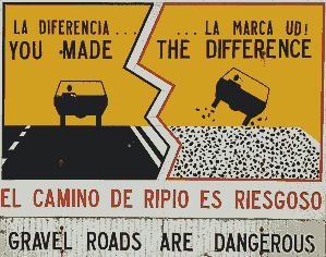 Findet man wie bei dem obigen Schild zur Gefährlichkeit der Schotterstraßen noch eine englische Übersetzung neben den verständlichen Bildern, dann ist man ja gut dran. Andernfalls sind spanische oder zumindest lateinische Grundkenntnisse gefragt.