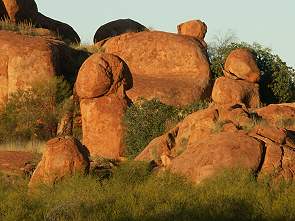 95 km südlich von Tennant Creek und 390 km nördlich von Alice Springs befindet sich das Marbles Conservation Reserve. Zum nächsten Roadhouse namens Wauchope sind es 10 km. Auf 1.828 ha liegen hier gigantische Granitkugeln in der Landschaft herum, unweit des Stuart Highway. Sie sind Teil der Davenport Ranges und entstanden vor Millionen Jahren, als hartes Granitgestein an die Erdoberfläche gepresst wurde. Dort kühlte die heiße Steinschicht zu schnell aus, es entstanden Risse und am Ende unterschiedlich große Gesteinsblöcke. Diese wurden dann im Laufe der Zeit durch Erosion zu den heute bekannten Formen geschliffen. Die enormen Temperaturschwankungen in der Wüste, von Minusgraden in der Nacht bis hin zu 40°C am heißen Tag, sorgen auch weiterhin für fortlaufende Zerstörung. Auch die Oxidation einzelner Mineralen schwächt den Fels und bewirkt ein ständiges Abblättern der oberen Schicht. Schilder an den Rundwegen erklären genau die Zusammenhänge der Entstehung dieser ungewöhnlichen Felsformationen.