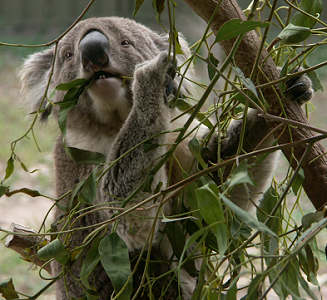 Selten sieht man einen Koala in Action. Meist sitzen sie träge herum und schlafen sogar beim Fressen ein. Da sie sich auf den Verzehr von eigentlich giftigen Eukalyptusblättern spezialisiert haben wird ihnen nur von wenigen Tieren die Nahrung streitig gemacht. Aber nur ein Bruchteil der vielen Eukalyptusarten, die es in Australien gibt, gehören zum Speiseplan eines Koalas. Und auch bei diesen Eukalyptusarten gibt es regionale Vorlieben.