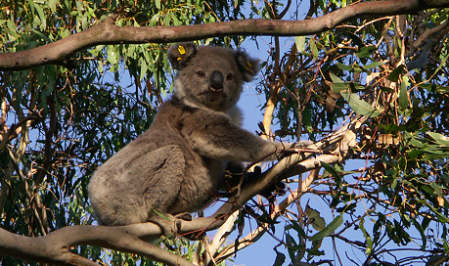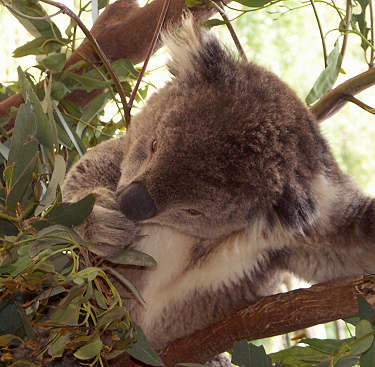 Die Koalas haben sich an das Leben in den Bäumen ganz besonders angepaßt, Schutz in Nestern und Höhlen suchen sie aber nicht. Je nach Temperatur sitzt der Koala anders in den Bäumen, mal als wärmespeichernde "Fellkugel" oder mit soweit wie möglich ausgestreckten kühlenden Gliedmaßen hängen sie in einer Astgabel. Egal wie, sie sind gut getarnt und schwer zu entdecken, am besten kann man sie noch in der Nacht mit der Taschenlampe beobachten, weil sie sich dann mit weit hörbaren Grunzlauten verständigen und so eventuell ihre Position verraten.