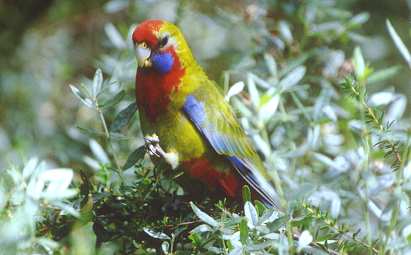 Über 140 Vogelarten hat man gezählt und man begegnet auf Schritt und Tritt den oft bunten Gesellen. Mt. Buffalo ist bekannt für seinen Bestand an Leierschwänzen, wir haben leider keinen gesehen. Dazu muss man am frühen Morgen oder bei Dämmerung unterwegs sein. Häufig sind Papageien und viele Arten von Honigessern zu beobachten. Die Pennant-Sittiche oder Crimson Rosellas sind beim Chalet angefüttert. Das Bild unten zeigt einen Jungvogel, später erhält er sein typisches knallrotes Gefieder. Krähen und Falken sind Vertreter der größeren Vögel.