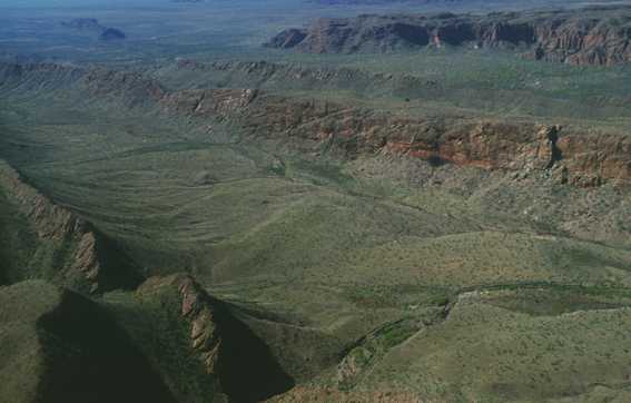 Dann folgen Berge, die sich in sanften Wellen aus der trockenen Ebene erheben. Man fliegt über einsam gelegene Rinderfarmen und über staubige Wege, die sich bin zum Horizont hinziehen. Dabei täuschen einen oft die trockenen Bachbetten, die aus den Bergen heraus in die Ebene verlaufen. Aus der Luft wirken die Flussläufe aus Sand und hellem Schotter oftmals wie Straßen, gegenüber denen man die echten Tracks leicht übersehen kann.
