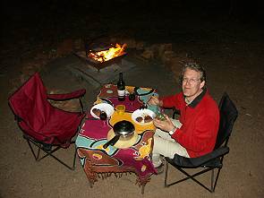 Von der Wanderung zurückkommend fanden wir den Campground immer noch nur mit unserem einsamen Camper besetzt vor. Was für ein Glück, wir hatten den ganzen N'Dhala Gorge Nature Park für uns alleine und die nächsten Manschen waren definitiv 8 Kilometer entfernt. Das sollte bis zu unserer Abfahrt am nächsten Mittag auch so bleiben, obwohl es Freitag und somit Wochenende war. Die flachen Holzplattformen, die man oft auf australischen Campgrounds als Picknicktisch findet, gab es auch hier. Sehr praktisch für Ausräumaktionen. Doch zuerst fachten wir das Lagerfeuer an und kochten unsere letzte Mahlzeit am Camper. Australien pur, die Stille genießend am knisternden Lagerfeuer die letzte Flasche Wein zu öffnen – was für ein Leben!