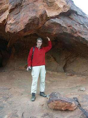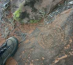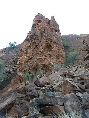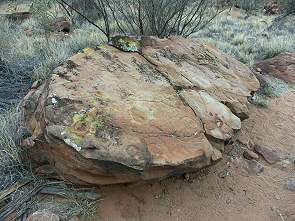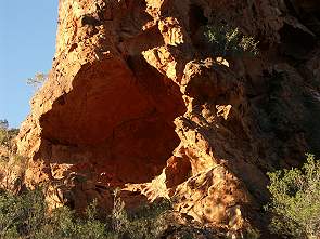 Sehenswert und geschützt durch die hohen Felswände sind hier die zahlreichen Rock Carvings (petroglyphs), die vor langer Zeit in großen Felsbrocken am Fuße der Schlucht geritzt wurden. Sie sind allerdings nicht einfach zu entdecken, die ältesten von geschätzten 10.000 Jahren sind schon stark verwittert und die jüngsten sind ungefähr 300 Jahre alt. Am Wegrand findet man auch versteinerte Muscheln als Beweis, dass sich hier einst ein Urzeitmeer erstreckte. Die Stille in der Schlucht wurde nur durch Rascheln und Vogelgezwitscher unterbrochen. Ständig suchten wir die Felshänge ab, aber kein einziges Wallaby ließ sich blicken. Wasser fanden wir auch nicht, vielleicht war die Jahreszeit einfach zu trocken und die Tiere hatten sich in Regionen mit ständigen Wasserlöchern zurückgezogen. Die großen Echsen hielten im Mai sowieso ihr Winterschläfchen.