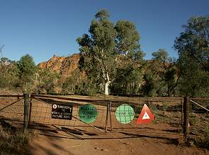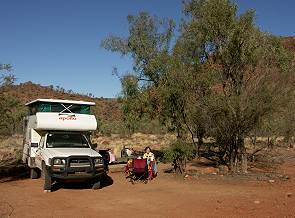 88 km von Alice Springs entfernt endet der asphaltierte Ross River Highway, eine 9 km lange Abzweigung endet am Ross River Homestead. Falls es in der N'Dhala Gorge voll belegt sein sollte, hätten wir hier eine Ausweichmöglichkeit gehabt. Die winzige Niederlassung Ross River am Ross Highway wurde Ende des 19. Jahrhunderts gegründet, zuvor befand sich an dieser Stelle die 1898 gegründete Rinderfarm Loves Creek Station. Schon seit 1959 ist der Ross River ein beliebter touristischer Ausgangspunkt für Ausflüge in die East MacDonnell Ranges.