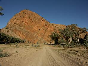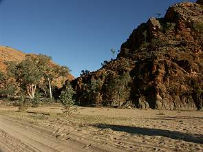 Ein kleiner, anspruchsvoller Track führt hinter der Ross River Homestead 8 km weiter zur Schlucht, hierfür braucht man ein Allradfahrzeug. Das meist trockene und steinige Bachbett des Hugh River muss insgesamt fünfmal überquert werden und es gibt einige sandige Abschnitte auf der Strecke. Nach Regen ist hier kein Durchkommen. Und schon im ersten Teil der Anfahrt begleiten beeindruckende Felswände den Besucher. Vor dem Gate sammelten wir noch schnell Brennholz für das abendliche Lagerfeuer ein und hoppelten über Stock und Stein langsam in Richtung N'Dhala Gorge.