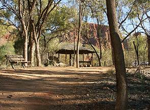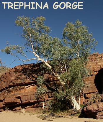 Folgt man dem Weg weiter, dann erhebt sich zur Rechten eine am Nachmittag wunderschön angeleuchtete Felswand aus rotem Sandstein. Direkt darunter befindet sich ein Campingplatz mit 8 Plätzen namens Trephina Bluff, auch dem schon einige Zelte und Camper standen. Doch hier ist man noch nicht an der Trephina Gorge, dafür fährt man noch ein Stück weiter. Der Weg führt durch ein breites sandiges Flussbett mit hohen River Red Gums am Ufer und dauerhaften Wasserlöchern in seinem Verlauf. Dann erreicht man nach 9 km ab Ross Highway den Parkplatz, an den ein weiterer Campground mit nochmals 10 Plätzen angeschlossen ist. Er heisst Trephina Gorge und war ebenfalls gut belegt, wir beschlossen, die Nacht lieber in der N'Dhala Gorge zu verbringen, in der Hoffnung auf mehr Einsamkeit. Die letzten 5 km der Strecke sind ungeteert, aber auch mit normalem Auto zu befahren. Ein Wanderweg, der Trephina Ridge Top Walk, führt vom Parkplatz aus zurück zu Jack Hayes Rockhole. Wir folgten dem einfachen Weg hinein in die Schlucht.
