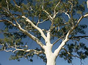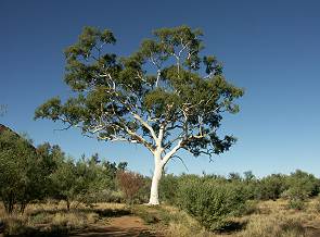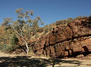 Auf der Fahrt in die Schluchten kommt man an einer kleinen Abzweigung vorbei, die zu einem sehr großen Ghost Gum führt, dem ältesten in den Eastern MacDonnells. Er soll über 300 Jahre alt sein, ein Abstecher lohnt sich auf jeden Fall. Unten auf den Bildern ist er zu sehen.