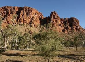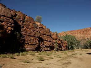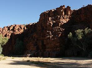 Zur Trephina Gorge gelangt man auch mit einem normalen Auto mit Asphalt unter den Reifen über den Ross Highway. 85 km von Alice Springs entfernt zweigt eine gut ausgeschilderte Stichstrasse nach links ab. In dieser Region prägen zwei völlig verschiedene Schluchten die eindrucksvolle Landschaft. Geschützt werden sie durch einen 1.700 ha großen Naturpark.