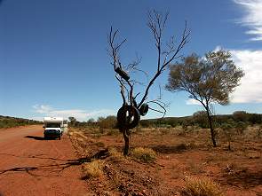 Die Route führt weiter durch Aboriginal-Land, bis zur Abzweigung zum Krater, die man unbedingt fahren sollte und auch darf. Nach einem Besuch geht es dann weiter über die gute bis sehr gute Schotterpiste, bis zur Einmündung in den von Hermansburg kommenden Larapinta Drive folgen sogar noch einige Kilometer geteerte Strecke. Hinter Abzweigung nach Westen dem Krater beginnt dann die eigentliche Mereenie Loop Road. Ab und zu kommt ein Auto in eine Staubfahne gehüllt entgegen, einmal sogar ein Radfahrer. Highlight am Wegesrand ist ein Baum mit alten Autoteilen und Reifen, ein beliebtes Fotomotiv.