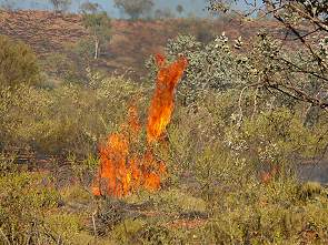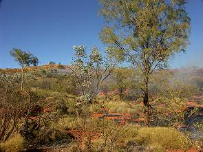 Wir starteten die Rundfahrt am frühen Morgen vom Campground an der Redbank Gorge in den Western MacDonnell Ranges. Schon nach ein paar Kilometern passierten wir ein kleineres Buschfeuer, verwirrte Rindviecher trotteten auf der Straße herum. In einer langen Schleife führt die Strasse um Gebirgsstöcke herum, vorbei an den seltenen Wüsteneichen (Desert Oaks) und durch weite Ebenen mit Spinifexgras. Ab und zu sieht man mit Glück unterwegs ein paar Kängurus, Brumbies (australische Wildpferde), wilde Kamele oder Esel am Wegrand.