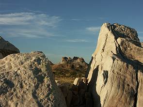 Am Tor stand geschrieben, man solle den CB Funk anmachen und eine Stange mit Fahne ans Auto stecken, denn die Dünen sind nur einspurig befahrbar und der Verlauf der Straße ist nicht einsehbar - Vorsicht, Gegenverkehr. Wir bekamen schon etwas Bammel, denn beides hatten wir nicht. Nun waren wir aber bis hierher gekommen, also nahmen wir die erste Düne in Angriff - und scheiterten. Mit ganz viel Gefühl brach Michael den ersten Versuch ab, bevor wir uns im tiefen Sand eingraben konnten und ließ den Wagen erst einmal den steilen Sandhang rückwärts wieder runter rollen. Im zweiten Anlauf kamen wir schon fast bis ganz oben. Dann war es, mit etwas Übung, Schwung und 4-WD aber kein Problem, die restlichen Dünen zu bezwingen. Der Oka war der letzte, der das Reserve am späten Nachmittag verlassen hatte und so kam uns kein Fahrzeug entgegen. Zur Vorsicht hupten wir vor jeder Düne, die Sandhügel sind bei der Anfahrt zum Chambers Pillar hinein steiler als bei der Rückfahrt.
