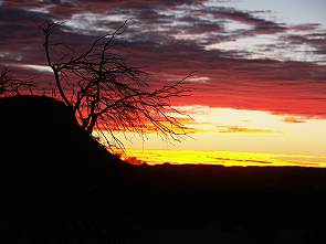 Diverse Wanderwege führen durch das Reserve. Leider hatten wir bis zum Einbruch der Dunkelheit nicht mehr so viel Zeit und genossen die wechselnden Farben des Felsens. Ein tiefes Glühen und der Feuerball verschwand hinter dem Horizont. Zeit für ein Lagerfeuer und eine kleine Kochorgie am Camper. Danach gingen wir zeitig ins Bett, um am frühen Morgen den Sonnenaufgang nicht zu verpassen.