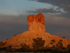 Am nächsten Morgen sind wir früh aus dem Bett gekrochen und haben erst mal das Feuer wieder frisch entfacht, denn es war ziemlich kalt. Leider gab es Wolken und eine Zeit lang sah es so aus, als hätten wir Pech. Doch dann verschwanden die Wolken und das erste Licht traf Chambers Pillar. Ein ganz anderes Licht als am Abend, aber nicht weniger beeindruckend. Auch der Castle Rock machte seinem Namen bei diesem Sonnenstand alle Ehre. Aber schon nach wenigen Sonnenlöchern verdichtete sich dann die Wolkendecke uns die Aussicht wurde trist.