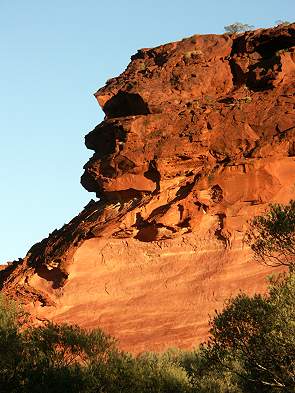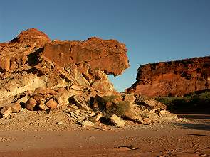 Hauptattraktion auf der rechten Seite neben den hohen Felswänden des Rainbow Valley ist der so genannte Mushroom Rock. Er erinnert, von der Seite betrachtet, entfernt an einen Pilz und ist auch kurz vor Sonnenuntergang am schönsten angeleuchtet. Man kann sich unter die Überhänge stellen, so groß ist er. Unter den Überhängen haben Schwalben ihre Nester gebaut, wie auch an vielen andern Stellen in den Felswänden. Überall in der Umgebung liegen große Felsklötze herum, eindrucksvolle Formen von Wasser, Wind und Sonne erschaffen.
