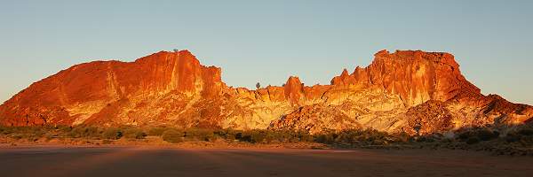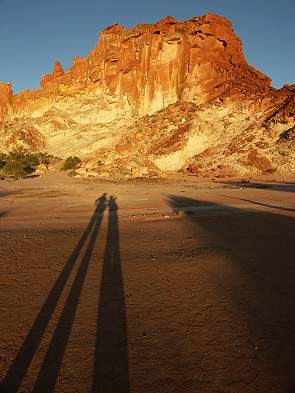 Auf der ersten Seite habe ich einiges zur Anfahrt und zum Campingplatz im Rainbow Valley Conservation Reserve geschrieben. Während man darauf wartet, dass die Sonne untergeht, sollte man auf jeden Fall einen kleinen Rundgang machen, um die nähere Umgebung zu erkunden. Nachdem wir den Camper geparkt hatten und alles für das Abendessen vorbereitet war zogen wir mit Sonnenschutz, Wasser und Kamera los. Es gibt hier eigentlich nur einen einzigen ausgewiesenen Wanderweg. Er führt zu den Felsen und in die James Range. Informationen zu Flora, Fauna und Geologie in der Region findet man auf den ausführlichen Hinweistafeln am Anfang des Tracks. Hier hängt auch die Box für die Self-Registration. Campen kostet hier, wie in den meisten Parks, 3,30 AU$ pro Person. Eintritt zahlt man nicht, wenn man das Rainbow Valley besuchen möchte. Für den Mushroom Rock Nature Trail benötigt man knappe 2 Stunden für den Hin- und Rückweg. Will man nur bis zum Mushroom Rock selbst laufen, dann sind es knapp 40 Minuten. Als wir losgingen war es schon später Nachmittag und bei unserer Rückkehr kamen wir gerade pünktlich zum Sonnenuntergang wieder am Parkplatz an.