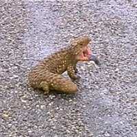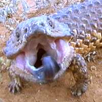 Wenn man einen Tannenzapfenskink an der Straße sitzen sieht, kann man aussteigen und sich ihm nähern. Im Gegensatz zu anderen Reptilien reagiert er in der Regel ziemlich sauer, er flüchtet nicht, sondern versucht, die neugierigen Besucher mit Drohgesten zu verscheuchen. Beeindruckend ist das Tierchen, wenn es sich irgendwie angegriffen fühlt. Dann öffnet es sein rosa Maul, reckt den Kopf nach oben und streckt die Zunge ganz weit heraus. Dabei faucht er leise. Auf Video habe ich solche Situationen aufgenommen, hier sind einige Standbilder davon. Das kleine Tierchen kann allerdings nicht zwischen Raubvöglen, Kängurus, Menschen oder Autos unterscheiden - auch ein Lastwagen wird mutig angefaucht. Wenn die Gefahr dann vorüber ist kann der Tannenzapfenskink ganz plötzlich ganz schnell verschwinden.