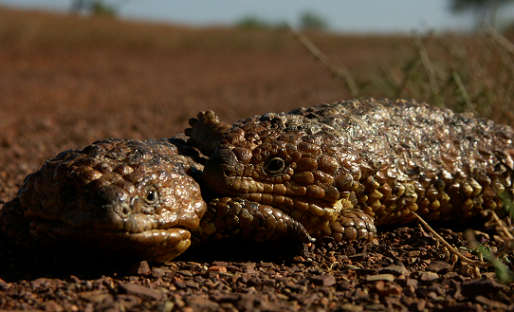 Vorbei an den kleinen Steinhaufen, die einmal ein Ort namens Simmonstown oder Hookina waren und heute als Ghost Town auf der Karte stehen, fuhren wir Dutzende von Kilometern über eine grasbewachsene, trockene Hochebene. Hier waren besonders viele Tannenzapfenskinke unterwegs, es war scheinbar Paarungszeit, denn wir sahen immer zwei, meist eng beieinander so wie auf dem Foto unten.