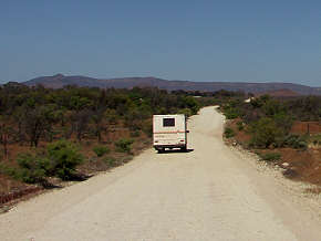 Uns beschlich das Gefühl, irgendwie auf dem Farmgelände gefangen zu sein. Wir wollten schon aufgeben und umkehren, aber dann deutete der weitere Verlauf der Straße auf einen Ausweg jenseits Bergkette hin. Eine Unterbrechung des Tracks durch ein ausgespültes Bachbett konnte uns nicht aufhalten, Michael schlängelte sich geschickt zwischen den Erosionsrinnen hindurch und folgte dann dem Feldweg in Richtung Berg. Mit dem Camper krochen wir hinauf und fanden oben dann endlich einen Ausgang an einer Stelle, wo vor uns schon andere den Zaun niedergefahren hatten: Auf der anderen Seite der Farmgrende lag hier eine öffentliche Gravel-Road. Nach einigen Problemen mit der Orientierung fanden wir dann einen Aussichtspunkt mit weitem Blick in die Landschaft und wieder den rechten Weg in Richtung Wilpena Pound, der am Horizont schon zu sehen war. Der Buckaringa Scenic Drive und der Lookout, auf den wir hier gestoßen waren, sind ziemlich neu angelegt und weit und breit war keine Menschenseele zu sehen.