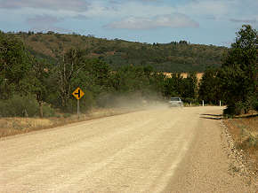 Die Straße führte malerisch vorbei an Felswänden und an Viehweiden mit zahlreichen Schafen und glotzenden Kängurus, an einem Gatter wurden wir darauf aufmerksam gemacht, daß wir hier privates Farmgelände durchqueren mussten. Anscheinend haben wir uns danach verfahren, denn der Track nahm und nahm kein Ende und irgendwann führte der holperige Weg immer nah am Zaun entlang. Weitere Schilder wiesen nur darauf hin, hier nicht bei Regen zu fahren. Wegweiser suchte man vergebens.